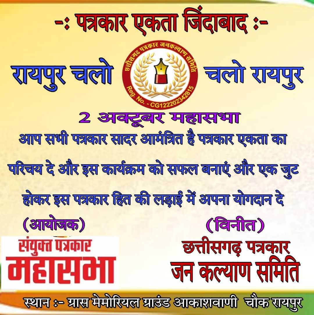 संयुक्त पत्रकार महासभा के आंदोलन को छत्तीसगढ़ पत्रकार जन कल्याण समिति द्वारा समर्थन किया जा रहा है आप सभी पत्रकार इस आयोजन में सादर आमंत्रित है जो भी पत्रकार आना चाहते है 2 अक्टूबर को वो अपना सीट जल्द से जल्द बुक करें